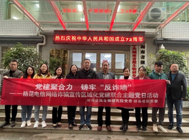 湖南省微生物研究院党委根据“我为群众办实事”实践活动部署要求,认真做好基层党组织联建工作,10月20日与所在桥头社区党委开展了党建聚合力,铸牢“反诈墙”的党建联合主题党日活动。双方主管党建、文明创建和安全生产的领导及负责同志参加了活动。