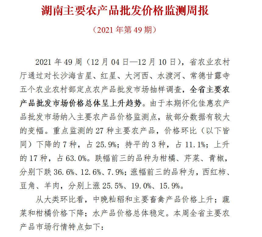 湖南主要农产品批发价格监测周报(2021年第49期)