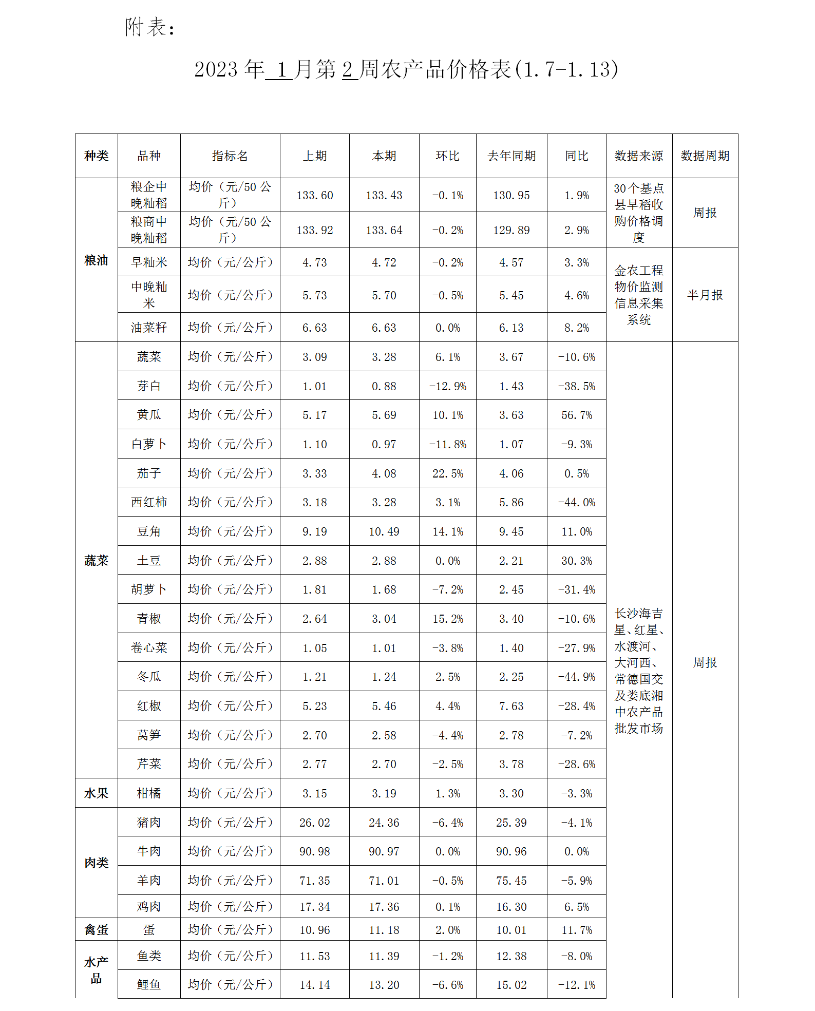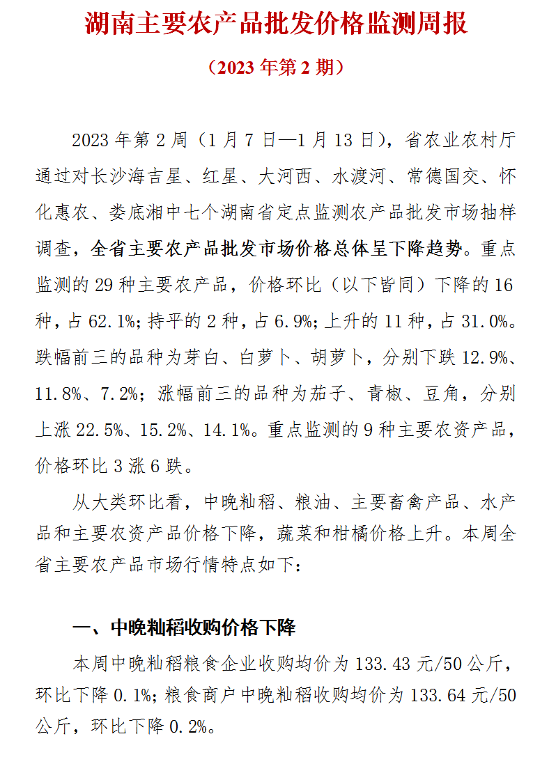 湖南主要农产品批发价格监测周报(2023年第2期)