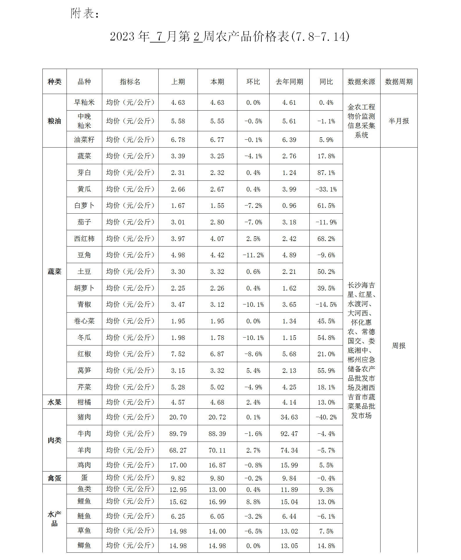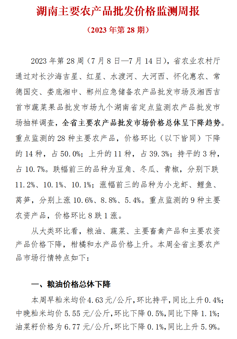 湖南主要农产品批发价格监测周报(2023年第28期)