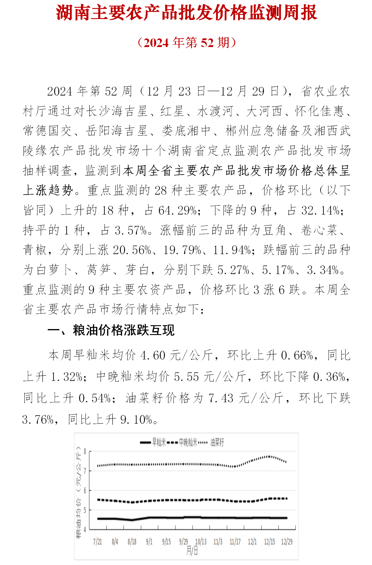 湖南主要农产品批发价格监测周报(2024年第52期)