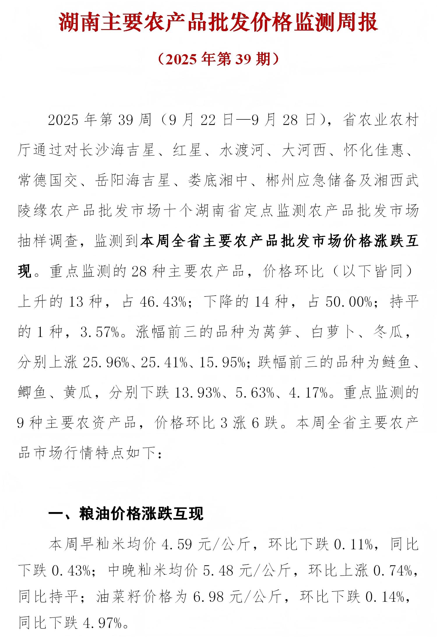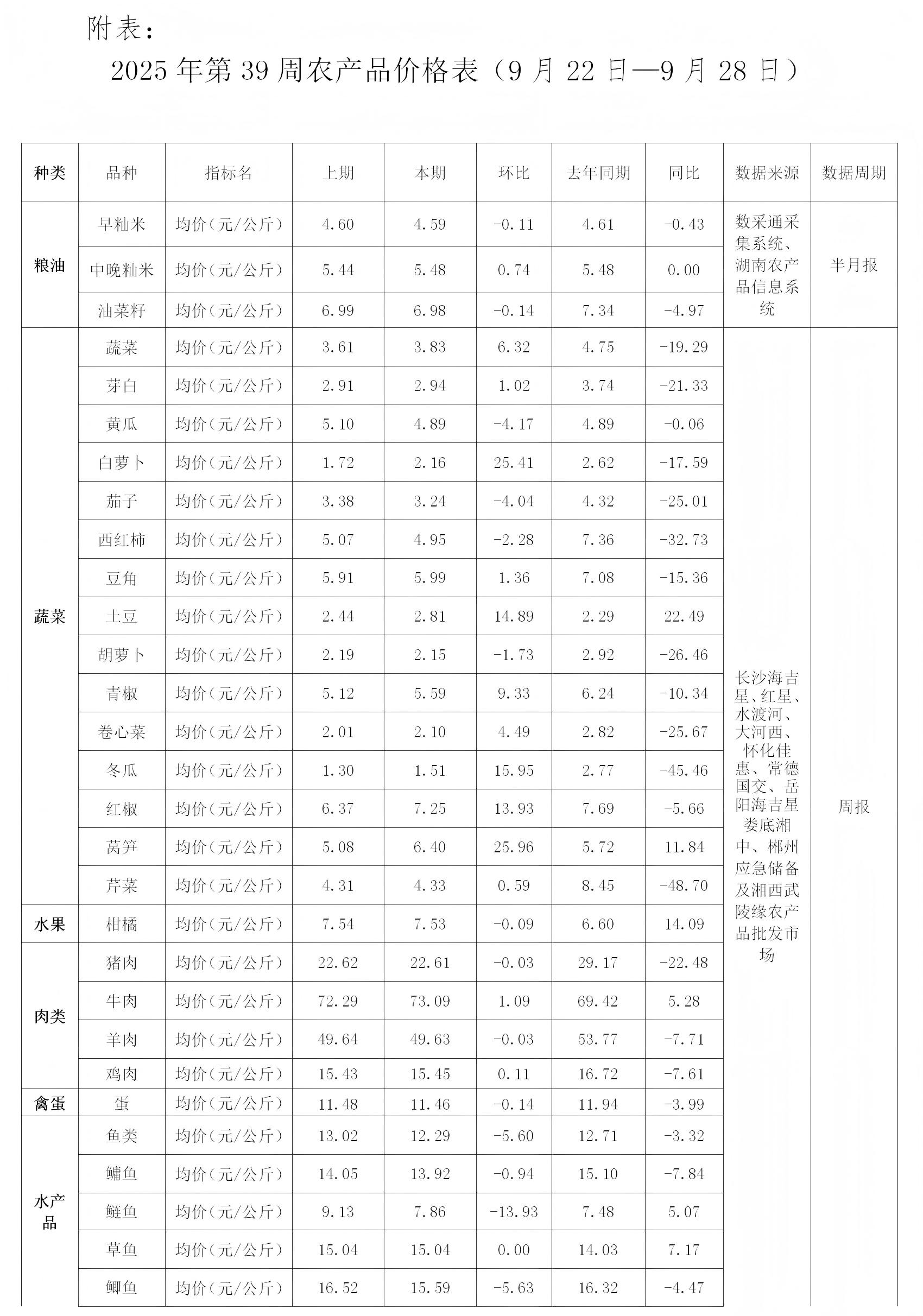 湖南主要农产品批发价格监测周报(2025年第39期)