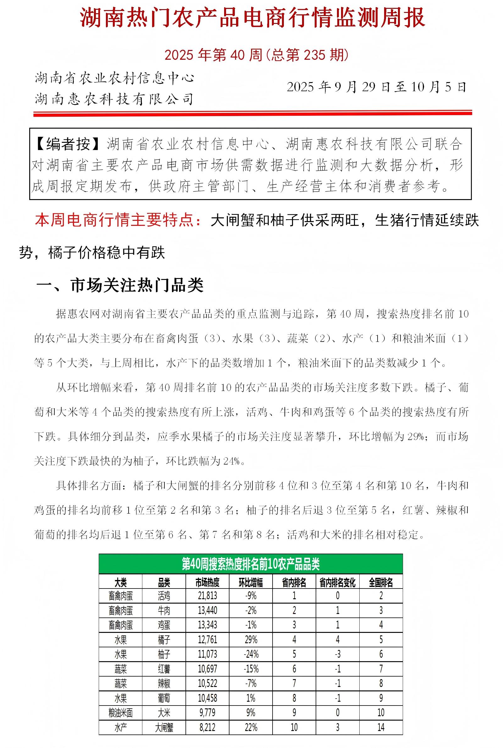 湖南热门农产品电商行情监测周报(2025年第40期)