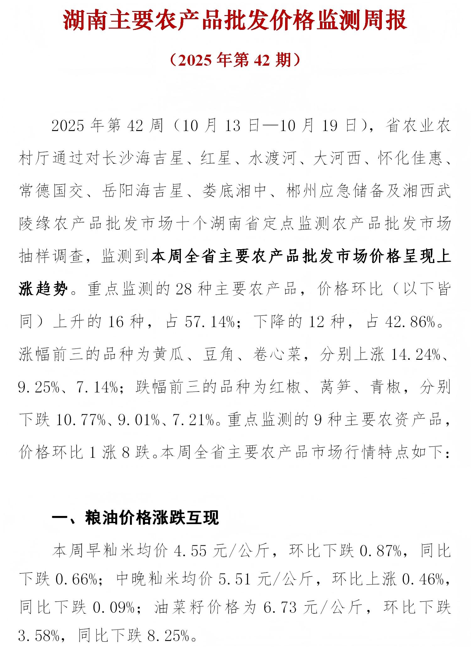 湖南主要农产品批发价格监测周报(2025年第42期)