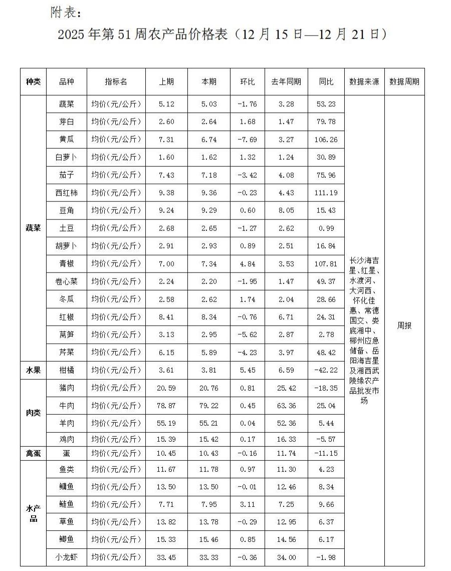 湖南主要农产品批发价格监测周报(2025年第51期)