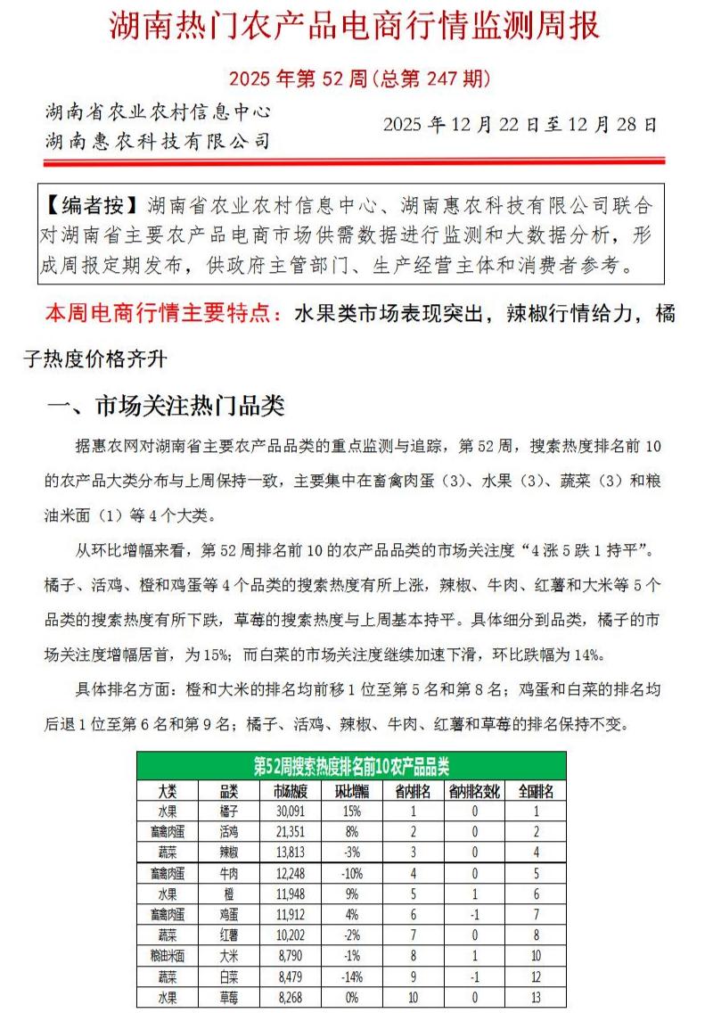湖南热门农产品电商行情监测周报(2025年第52期)