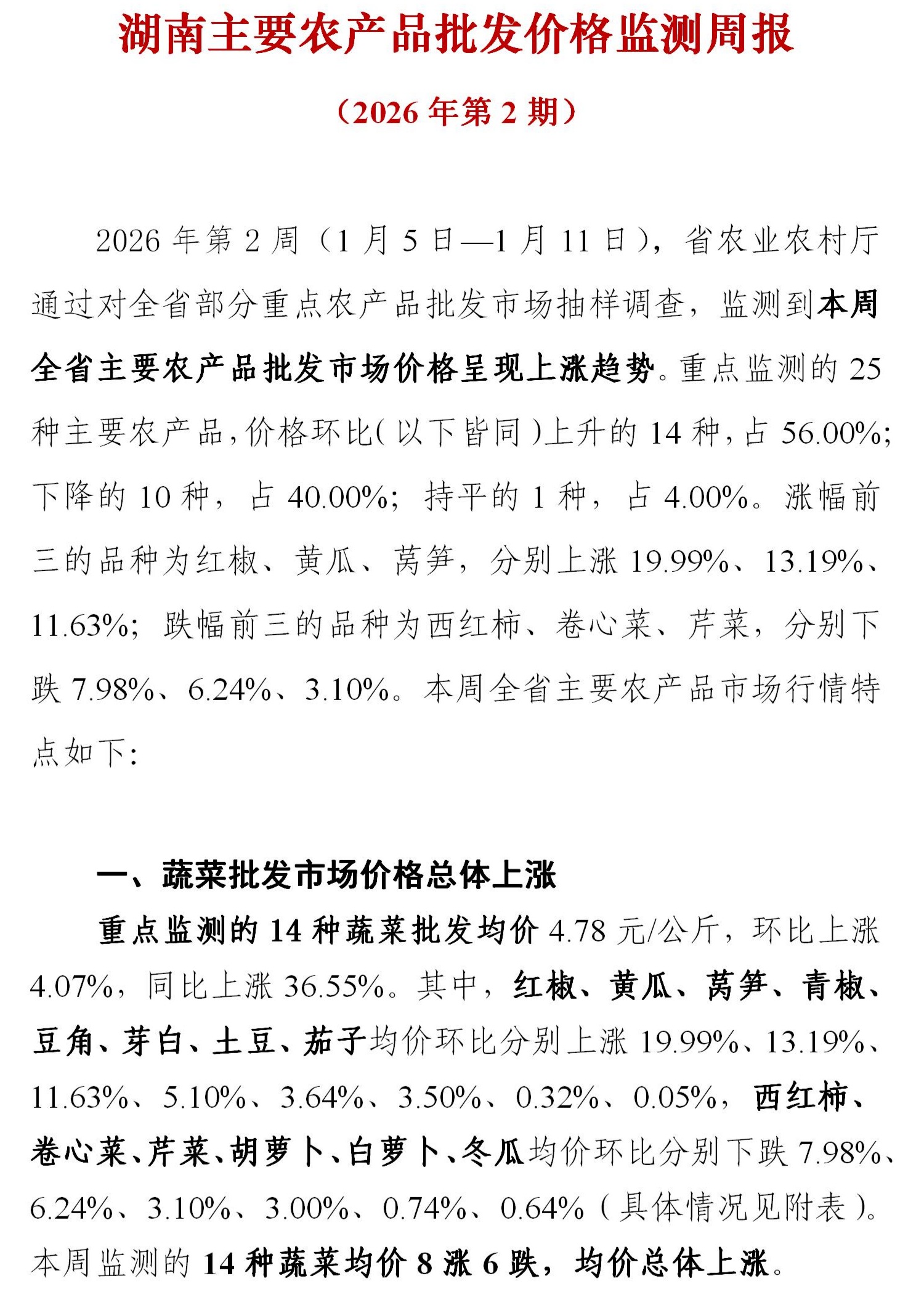 湖南主要农产品批发价格监测周报(2026年第2期)