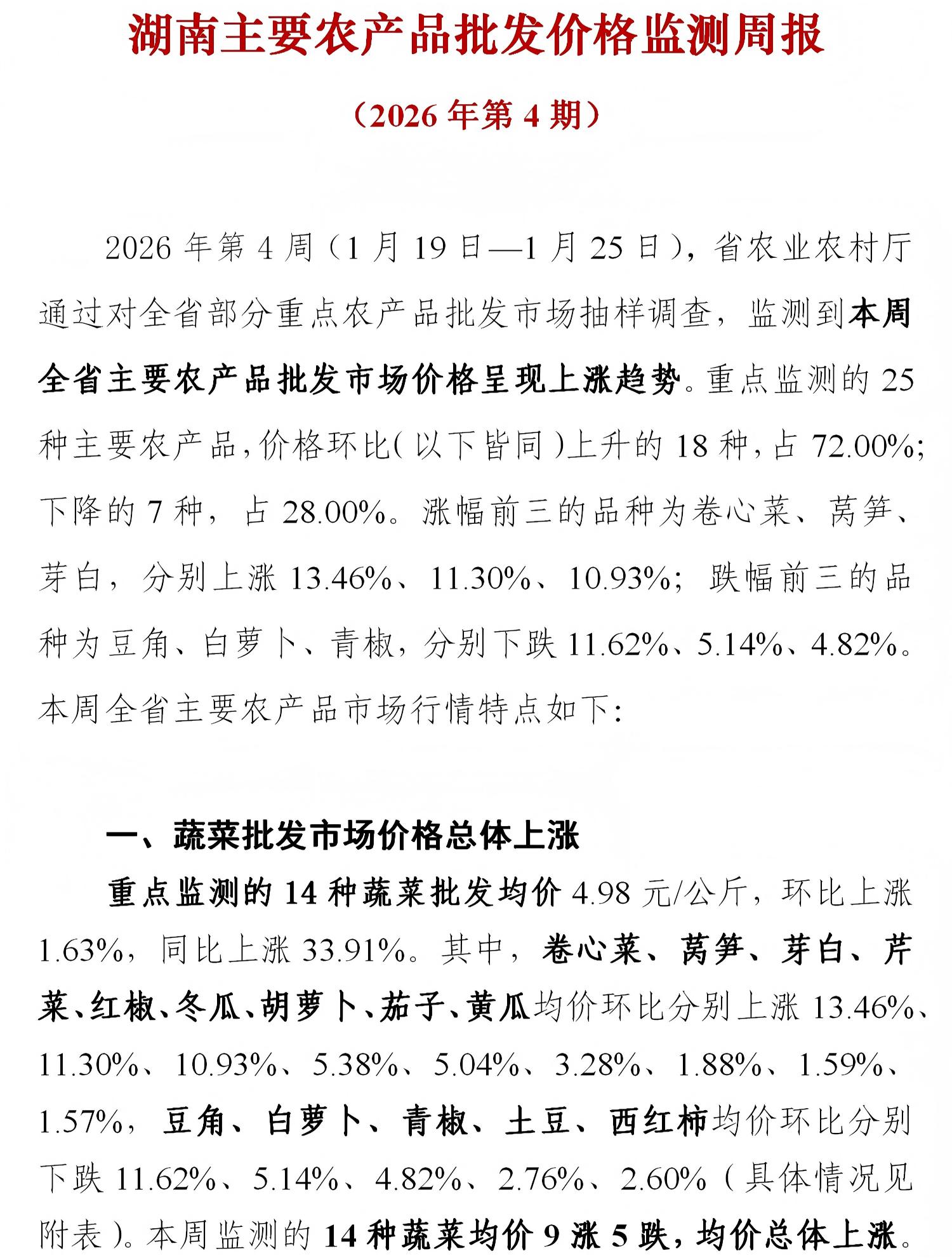 湖南主要农产品批发价格监测周报(2026年第4期)