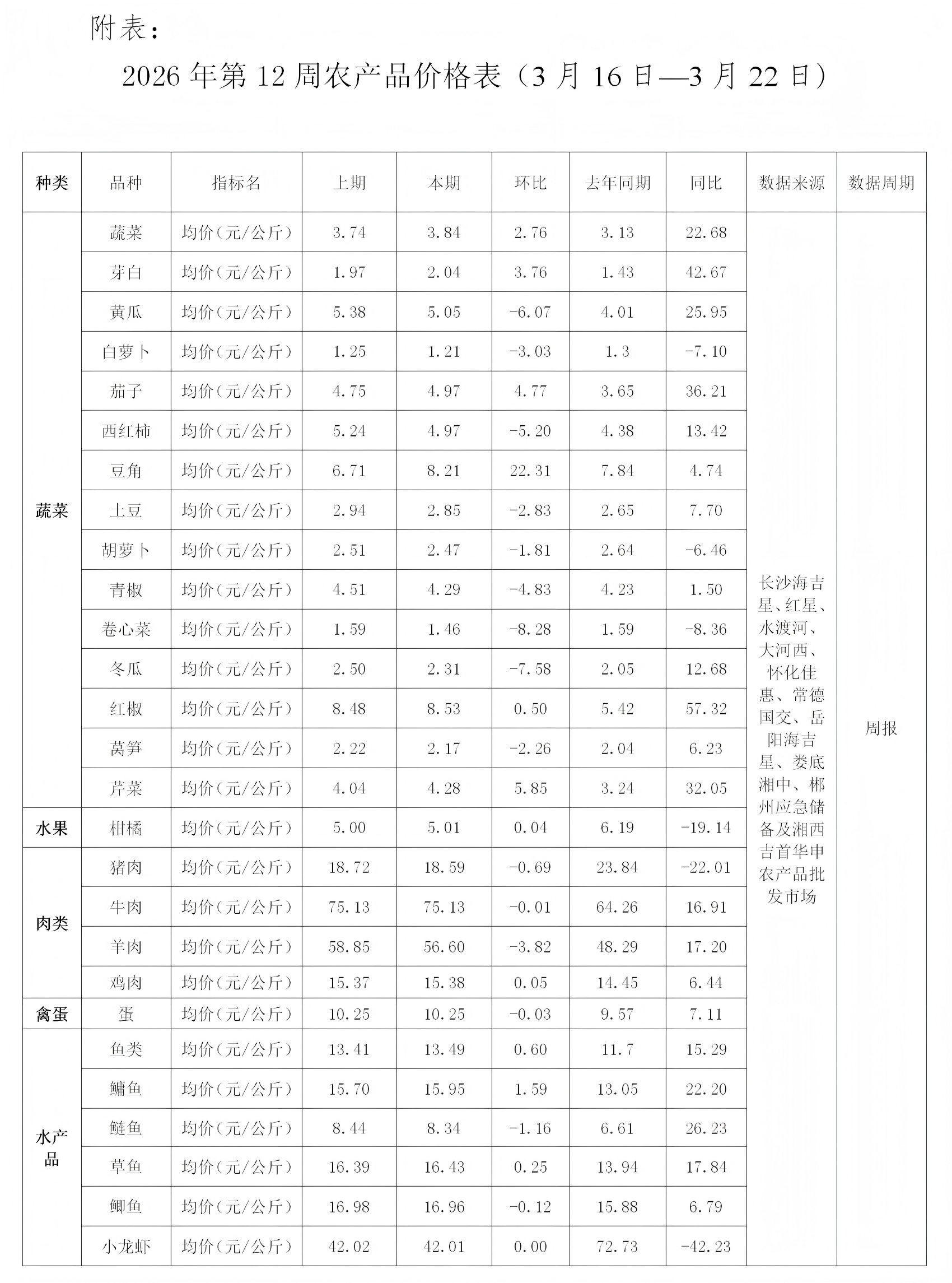 湖南主要农产品批发价格监测周报(2026年第12期)