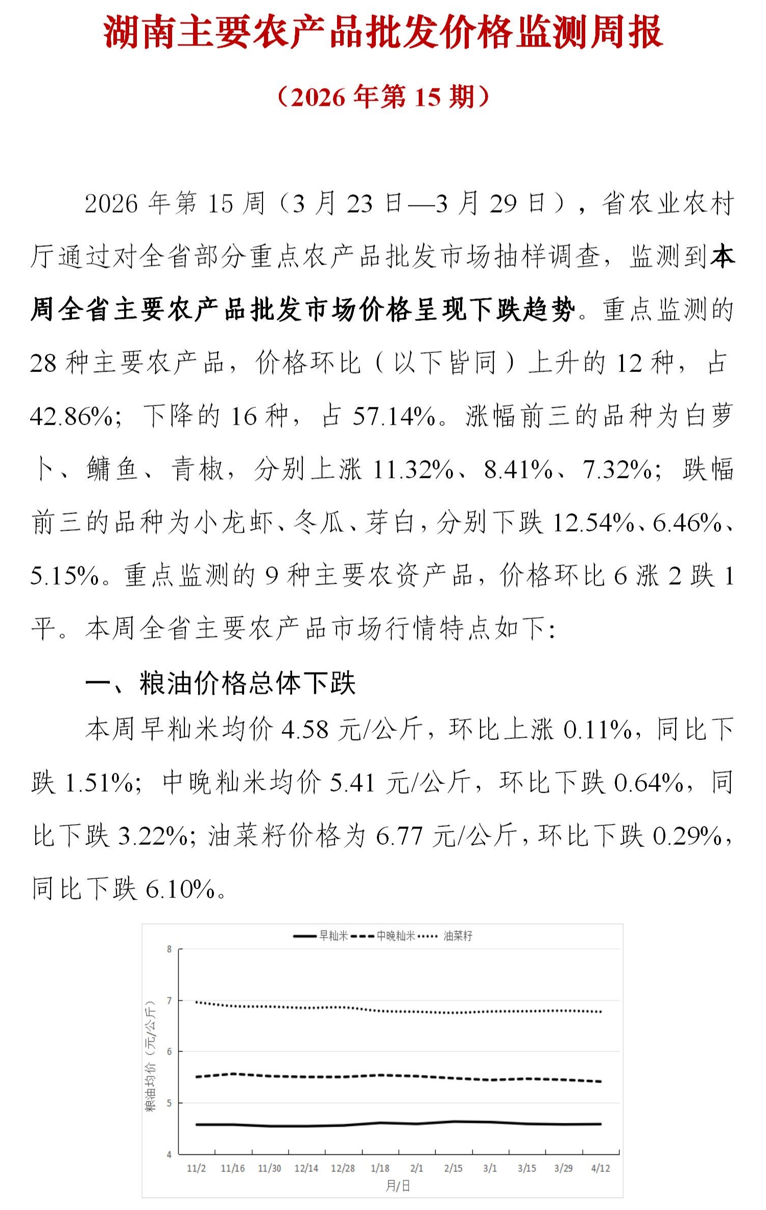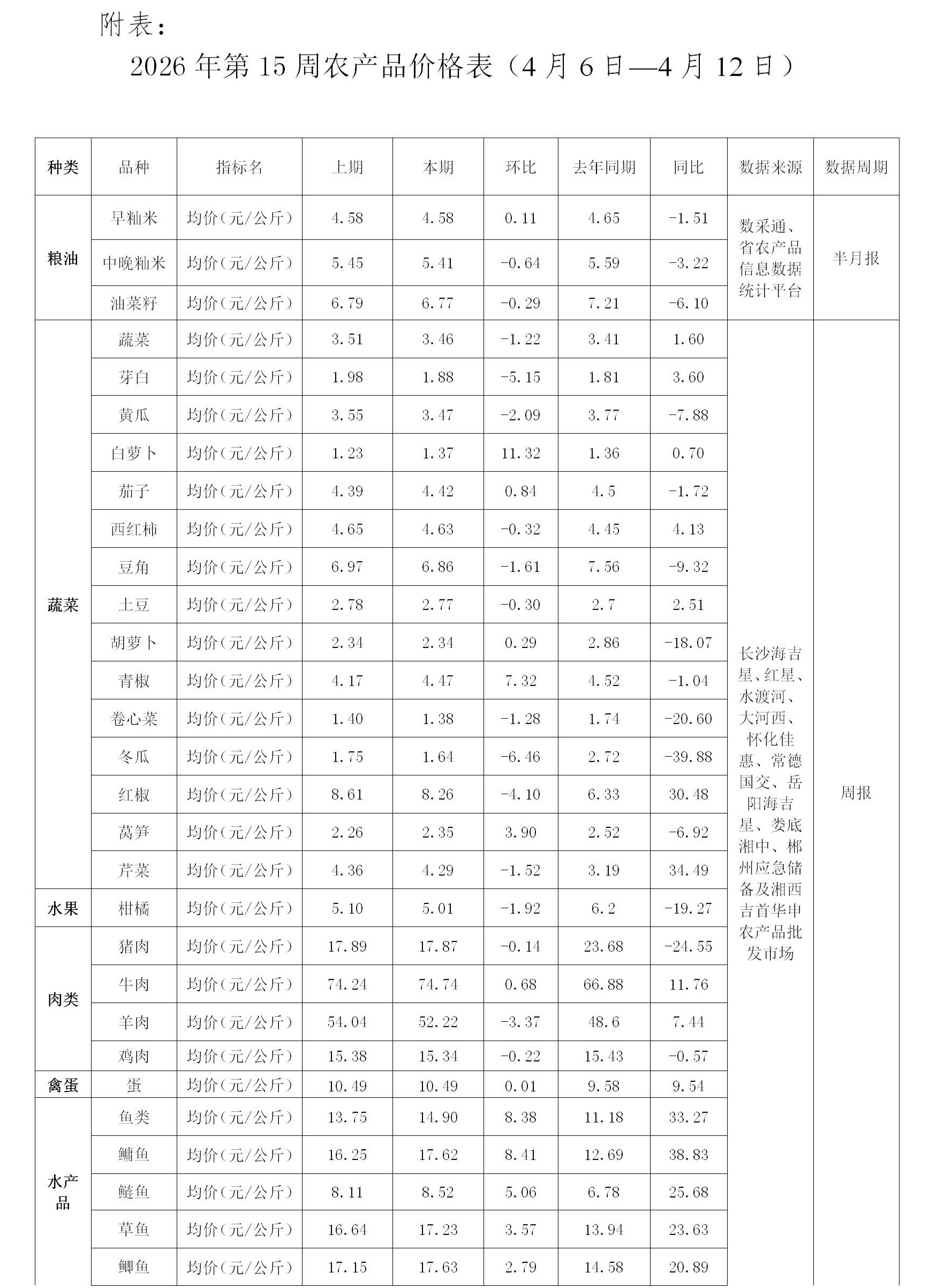 湖南主要农产品批发价格监测周报(2026年第15期)