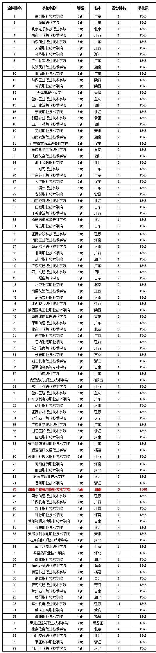 2017年1月12日,中国科学评价研究中心(RCCSE)、武汉大学中国教育质量评价中心(ECCEQ)和中国科教评价网联合发布了2017年中国高职高专院校竞争力排行榜。我院在全国1346所高职院校中排名第75位,省内排名第3位。