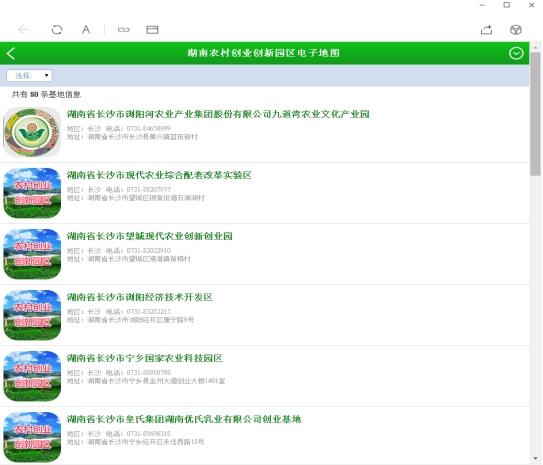 “湖南省农村双创园区(基地)电子地图”按照互联网+“双创”的工作思路,建立起我省农村“双创” 园区(基地)信息发布平台。在B/S技术环境下,通过电子地图和应用软件,便捷直观反映全省所有双创园区(基地)的地理位置分布和基本情况,并通过不同查询条件,可便捷准确按市、县划分查询,完成地理位置分布展示,实现统计功能。同时实现手机微信端同步显示。除了提供地理位置、联系方式查询服务外,还将园区(基地)为创业者提供的优费政策、配套服务等简要情况予以发布,具备手机端导航功能,为全省返乡下乡本乡人员创业创新提供指引。