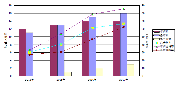 2014年,参加能力验证单位要求是市州农产品质检机构和已建成的国家质检体系建设规划项目县农产品质检机构, 2017年,逐年增加了通过“双认证”的县级和农产品质量安全试点示范县的农产品质检机构,参加单位由原来的23家增长至33家,其中市级农产品质检机构完成全覆盖,县级农产品质检机构逐年增加趋势明显,第三方机构也开始加入;总合格率呈现逐年上升趋势,由30.4%上升至66.7%,其中,市州合格率由33.3%上升至88.7%,县级合格率由27.2%上升至62.5%(如图1所示)。