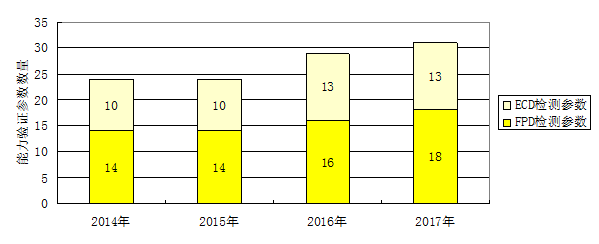 四年来,能力验证参数的数量缓慢增加,技术难度也随之逐年提升。2014年,验证参数24种,其中有机磷类(FPD检测)14种,有机氯、除虫菊酯类(ECD检测)10种;2017年,验证参数增至31种,其中有机磷类(FPD检测)18种,有机氯、除虫菊酯类(ECD检测)13种(如图3所示)。