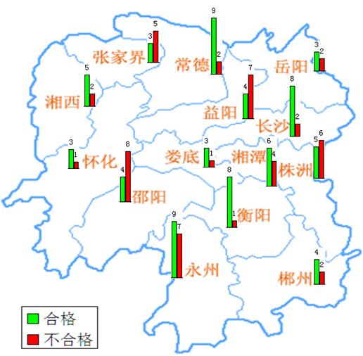 四年来,参加能力验证(含复验)次数最多的为永州市16次,最少的区域为娄底市、怀化市4次,区域参与度高的主要原因是县级检测机构的加入;合格率比较高的市州是长沙、常德、衡阳三市,不合格次数主要由县级机构造成,反映出县级质检机构水平总体偏低(如图2所示)。