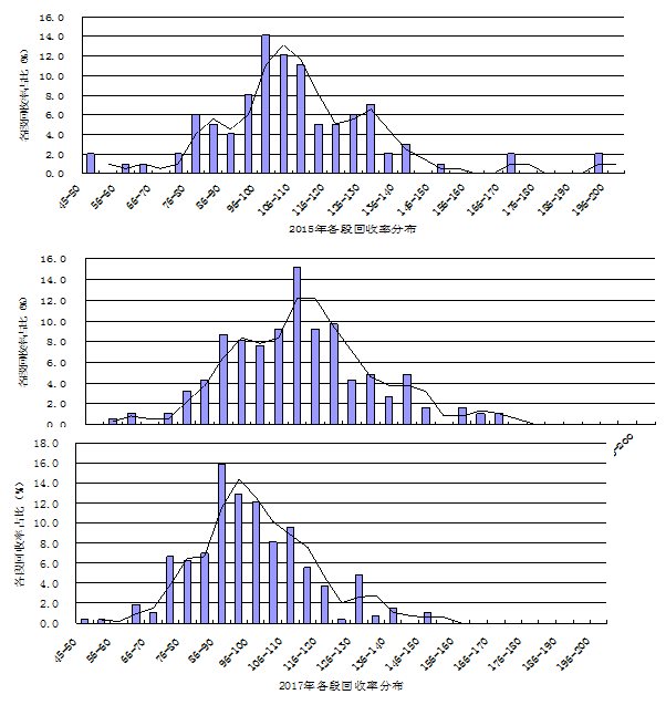 情况表明,首次全省能力验证,参加单位的农药残留定量检测水平参差不齐,异常结果(回收率±>30%)较多,但是,随着参加单位验证经验积累和技术能力的提升,技术稳定性不断增强,直接体现在各回收率段分布及趋势线的变化,2014年至2017年异常回收率段(回收率±>30%)逐年减少,趋势线逐渐收窄。