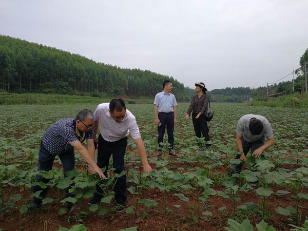 6月14日,省棉花产业体系首席专家张志刚研究员一行在衡阳县农业局总农艺师刘康星和衡阳实验站站长徐三阳等陪同下,深入衡阳站四片试验示范基地检查空闲地直播、油后直播及营养钵育苗移栽等不同播种方式田间生长情况。