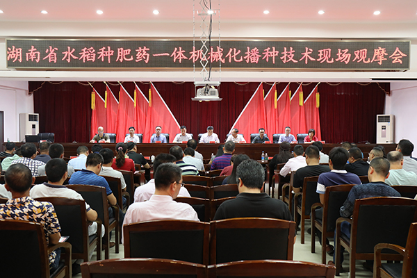 为加快农业供给侧结构性改革,提高水稻轻简化、机械化水平,进一步提高种田效益,加快推进乡村振兴战略,6月4日上午,全省水稻种、肥、药一体机械化播种技术现场观摩会在大通湖召开,省农委副巡视员罗振新参会并讲话,大通湖区管委会副区长周军、益阳市农委副主任万华、省推广总站、省农机局、省植保站、省土肥站相关负责人,9名市州推广站负责同志、26个县市区农业局分管局长或推广站长、种植大户等参加了会议。会上,宏硕生态农业农机合作社理事长熊姣军汇报了近三年水稻种、肥、药一体机械化精量播种技术试验情况,湖南农大唐启源教授详细讲解了一体机械化精量播种技术要点,中国工程院院士、华南农业大学罗锡文教授参加会议并就“水稻机械化播种技术与机具”作专题讲座。