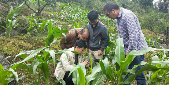 图为凤凰县农业农村局技术专家与林峰乡农技干部在土洞村玉米大田查看研究草地贪夜蛾防治技术