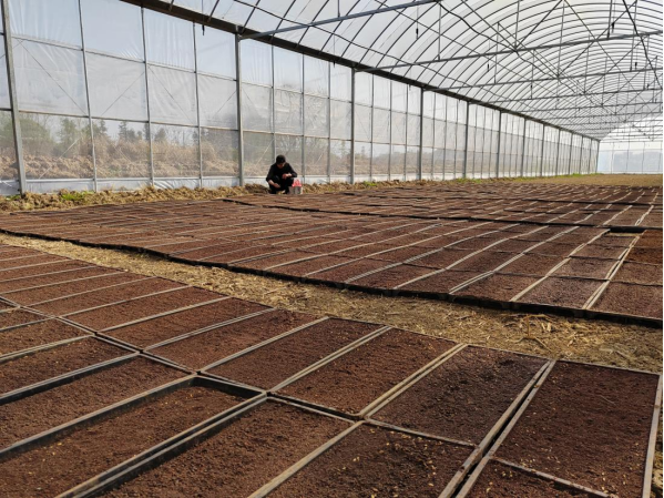 在船湾镇狮力村金辉农机服务农民专业合作社新建的育秧大棚内,一排排秧盘整齐地摆放着,该合作社已于3月4日完成了第一批早稻育秧播种,过几天便能萌发出一片新绿。