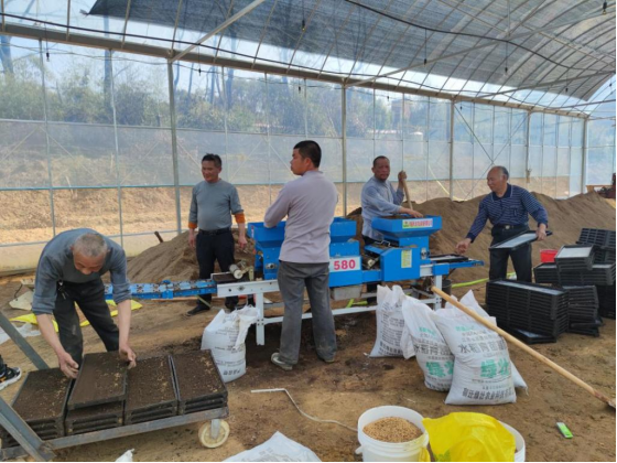 在泗汾镇石家湾村庞田农机集中育秧中心内,几名工人熟练地将育秧盘整齐有序地放上输送带,经过机器自动填入营养土、加入种子、喷洒水雾、盖上基质,一个个完整的育秧盘就从机器的另一头出来,再由工人将其放到附近大棚内进行催芽。这是该合作社首次利用连栋钢架育秧大棚完成的第一批机械化育秧。