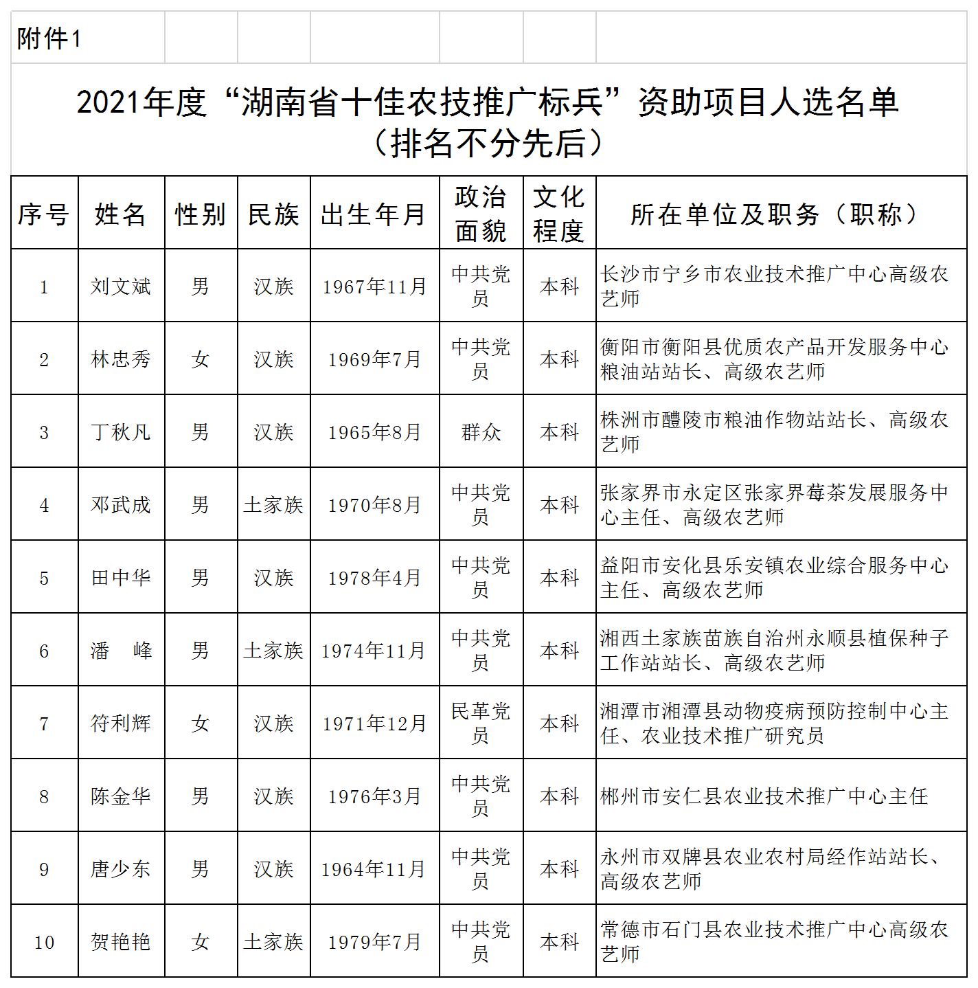 2021年度“湖南省十佳农技推广标兵”“湖南省十佳农民”资助项目人选公示