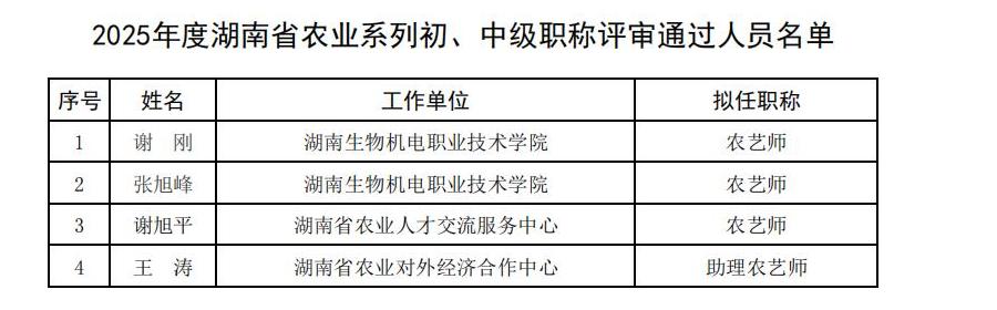 2025年度湖南省农业系列初、中级职称评审结果公示