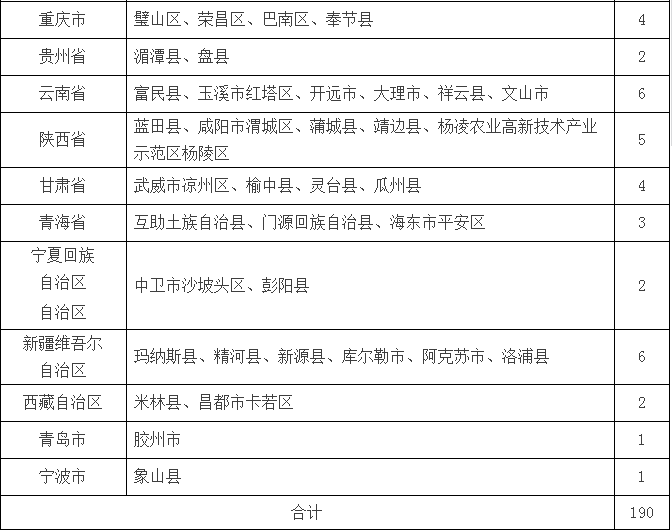 为贯彻落实中央关于加强农村集体资产管理工作的精神,充分发挥典型示范带动作用,推进全国农村集体资产管理工作制度化、规范化、信息化,在各省、自治区、直辖市及计划单列市推荐的基础上,经审核,现认定北京市昌平区等190个县(市、区)为第三批全国农村集体“三资”管理示范县(名单附后)。