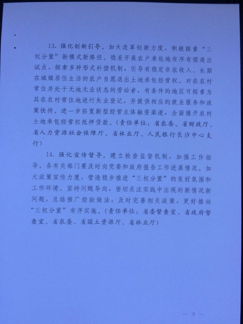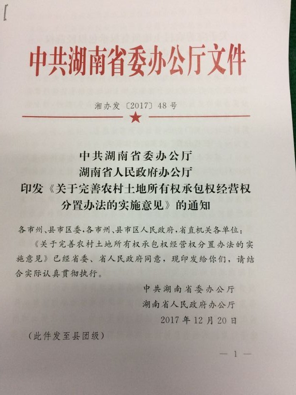 中共湖南省委办公厅 湖南省人民政府办公厅印发《关于完善农村土地所有权承包权经营权分置办法的实施意见》的通知