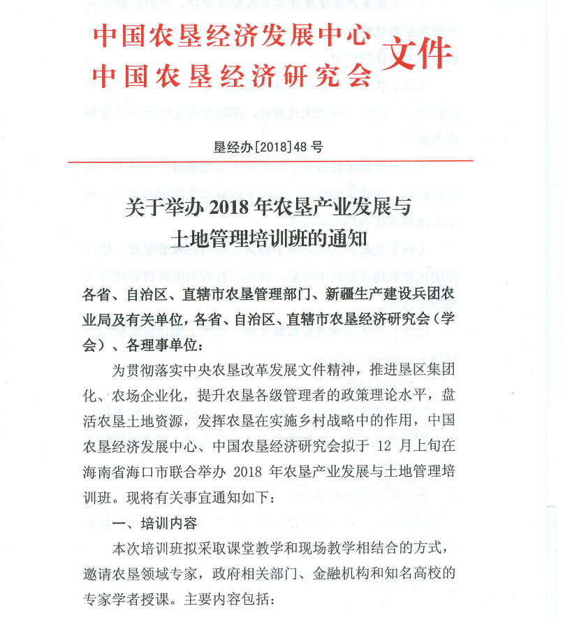 关于举办2018年农垦产业发展与土地管理培训班的通知