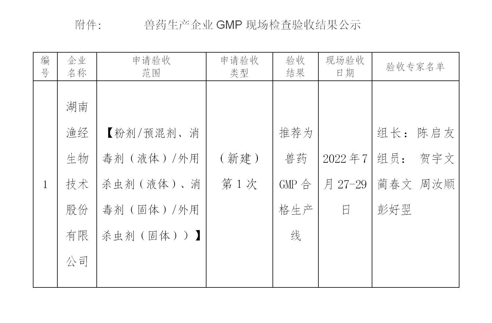 根据《兽药生产质量管理规范(2020年修订)》的规定,依照《兽药生产质量管理规范检查验收办法》《兽药生产质量管理规范检查验收评定标准(2020年修订)》,我办派出专家组对湖南渔经生物技术股份有限公司GMP实施情况进行现场检查验收。现将检查验收结果予以公示(见附件),公示期为2022年8月10日至8月16日,如有不同意见,请向我办反映。