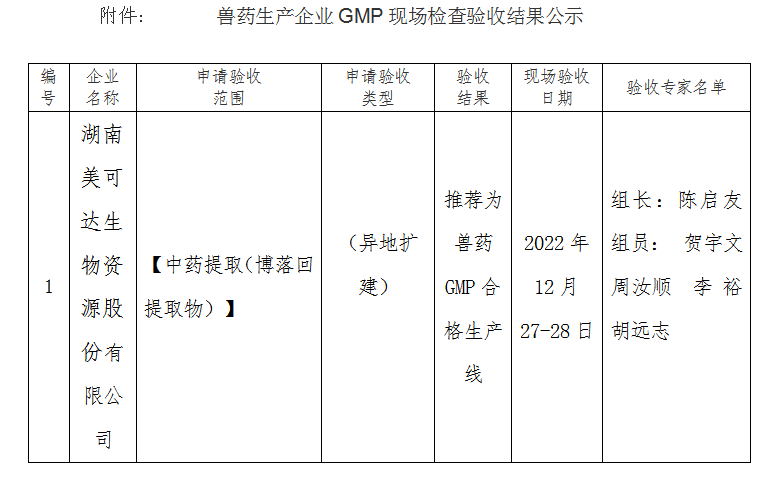 根据《兽药生产质量管理规范(2020年修订)》的规定,依照《兽药生产质量管理规范检查验收办法》《兽药生产质量管理规范检查验收评定标准(2020年修订)》,我办派出专家组对湖南美可达生物资源股份有限公司GMP实施情况进行现场检查验收。现将检查验收结果予以公示(见附件),公示期为2023年1月16日至2023年1月22日,如有不同意见,请向我办反映。