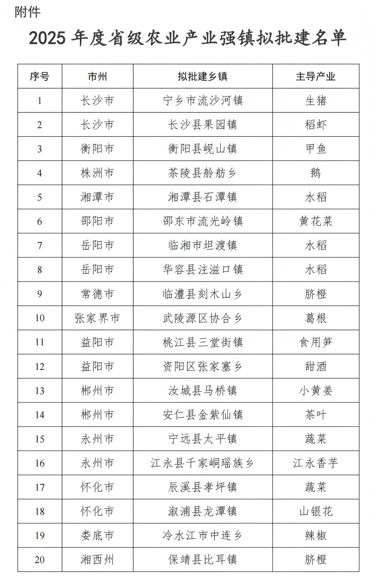 经由县市区申报、市州农财两家联合推荐、省级核查评审和会议研究,拟批准长沙市宁乡市流沙河镇等20个乡镇(具体名单见附件)建设省级农业产业强镇,现予以公示。公示期为2026年2月6日至2月14日。公示期间,如对公示对象有异议,可通过电话或电子邮件反馈。反映情况必须真实、准确,不接受匿名反映情况。