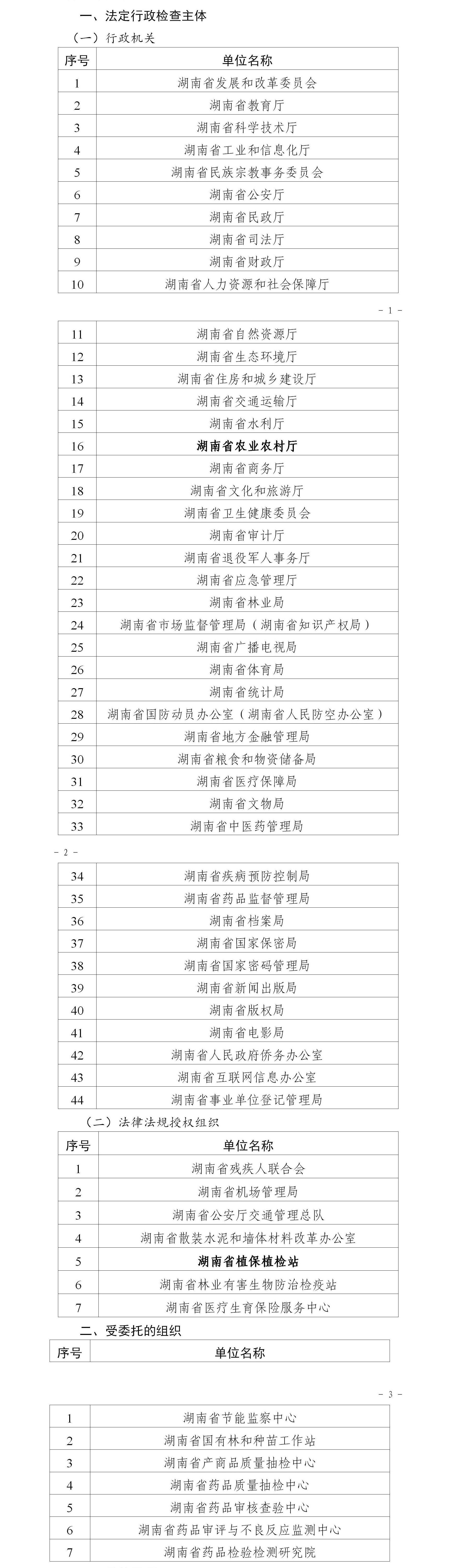 为深入贯彻落实党中央、国务院关于规范涉企执法的决策部署,根据《国务院办公厅关于严格规范涉企行政检查的意见》(国办发〔2024〕54号)和《湖南省人民政府办公厅印发<关于严格规范涉企行政检查的实施方案>的通知》(湘政办发〔2025〕5号)有关规定,省司法厅开展了省本级行政检查主体资格清理确认工作,经省人民政府审定,现将省本级行政检查主体公布如下。