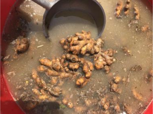 将掰好的姜种用1:1的70%噁霉灵可湿性粉剂:50%氯溴异氰尿酸可溶粉剂,1500倍液浸种30分钟,晾干播种。