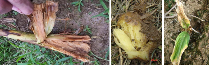 危害特征及典型性状:主要危害姜块和地上茎。初期,姜块表面出现水渍状黄褐色病斑,逐渐软化腐烂;中期,病部渗出灰白色黏液,散发恶臭(区别于真菌性腐烂的无臭味)。后期,姜块完全腐烂,植株叶片萎蔫枯死。