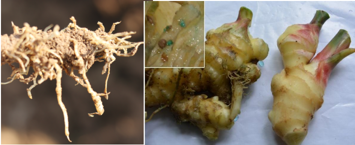 危害特征及典型性状:主要危害生姜根系及地下姜块。发病时,根系形成大小不一的瘤状根结(虫瘿),严重时根系肿胀、扭曲;植株矮小,叶片黄化、萎蔫,生长迟缓,类似缺肥缺水状;受害姜块表面凹凸不平,出现褐色坏死斑,影响品质和储存性。