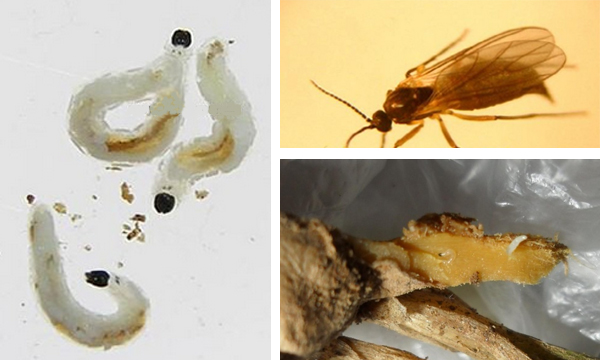 危害特征及典型性状:幼虫蛀食姜块、根茎和嫩芽。发生时,姜块表面出现蛀孔和褐色隧道,受害姜块腐烂变臭,植株生长迟缓、叶片发黄,严重时整株枯死。