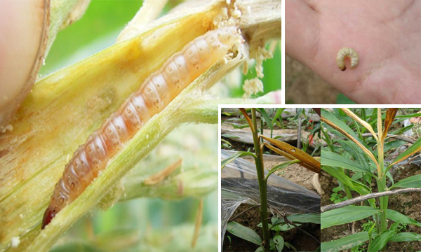 危害特征及典型性状:幼虫蛀食茎秆、叶鞘和新生姜芽。发生时,茎秆出现蛀孔和褐色排泄物,受害植株出现“枯心苗”(生长点被蛀食),茎秆易折断,导致水分养分运输中断,虫道内可见幼虫及虫粪。