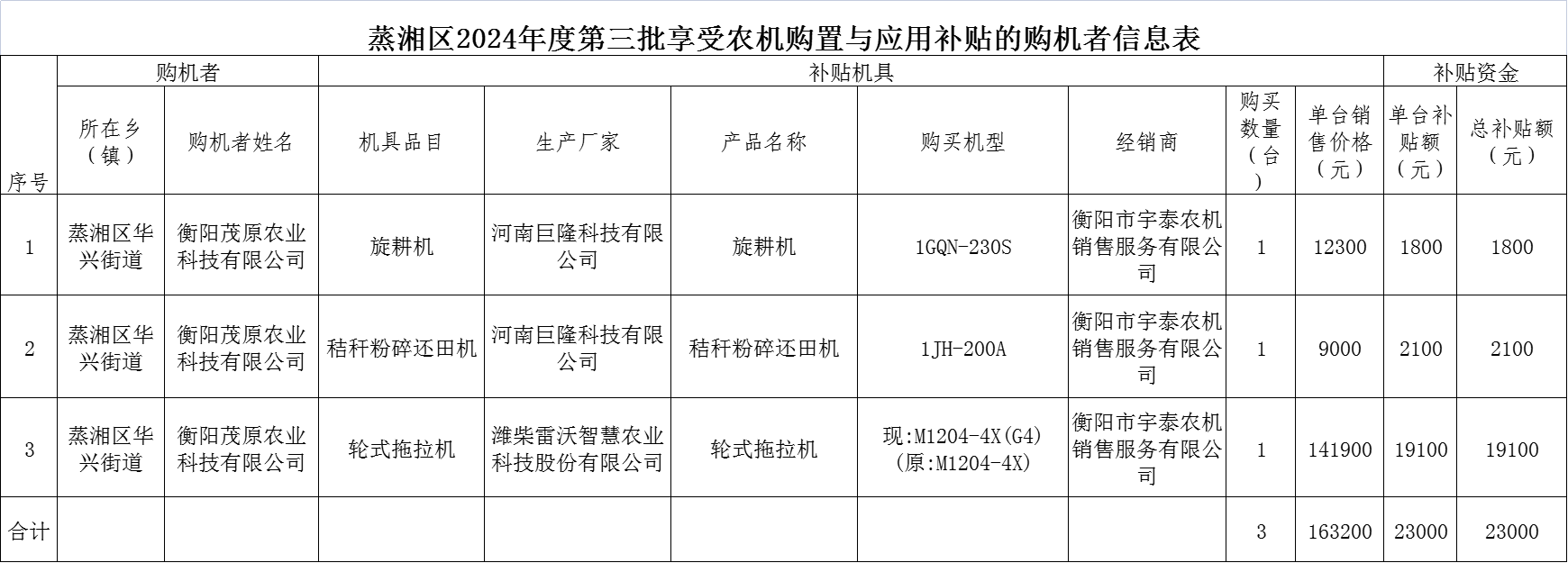 2024年度蒸湘区第三批享受农机购置与应用补贴的购机者信息表