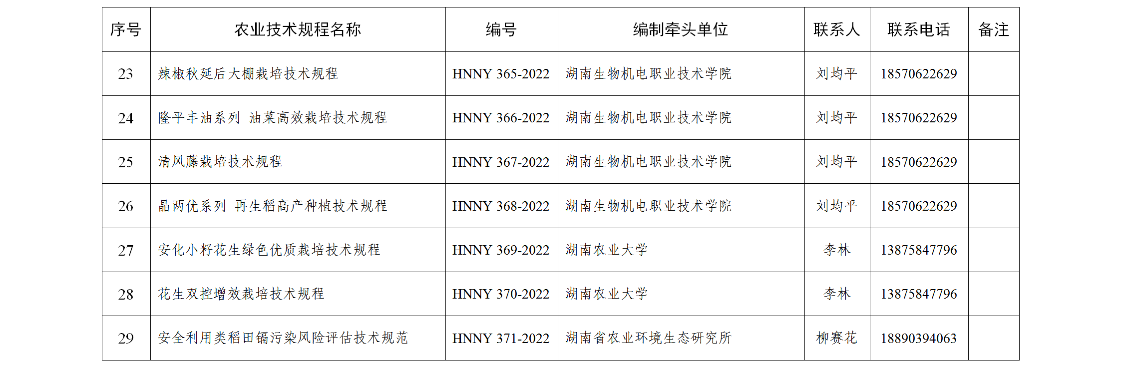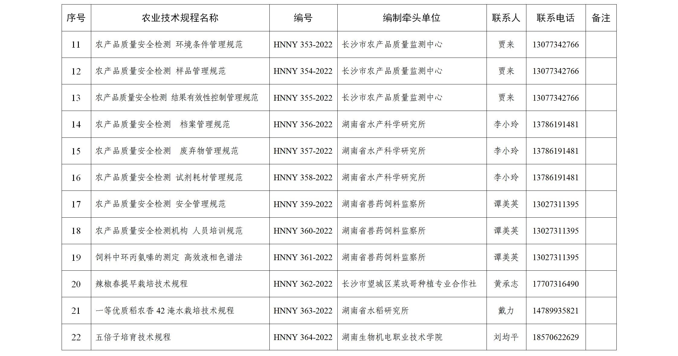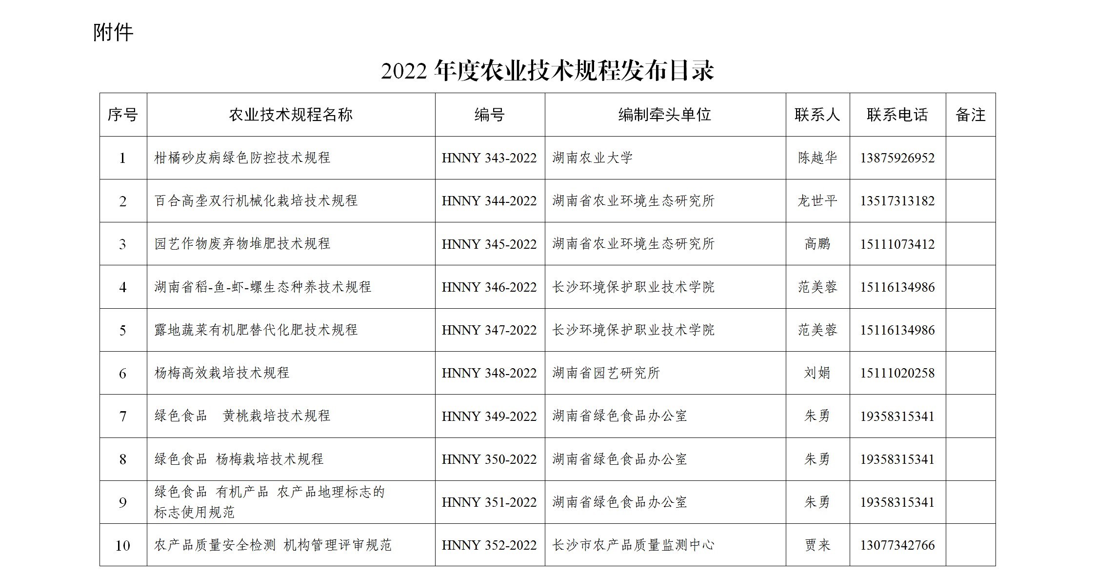 各有关单位要积极开展推广培训工作,促进农业技术规程的生产应用和农业标准化水平提升。规程应用中如有问题请及时联系制修订单位,或向我厅农产品质量安全监管处反映。联系人:戴雄伟,通讯地址:长沙市开福区教育街66号,邮政编码:410005,电子信箱:hnncpzjc@163.com,电话0731-84420707,15802656777。