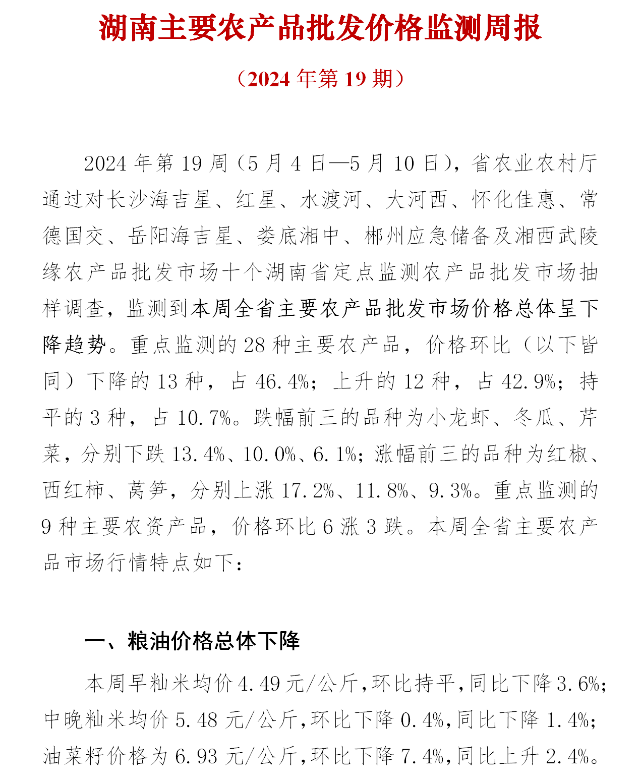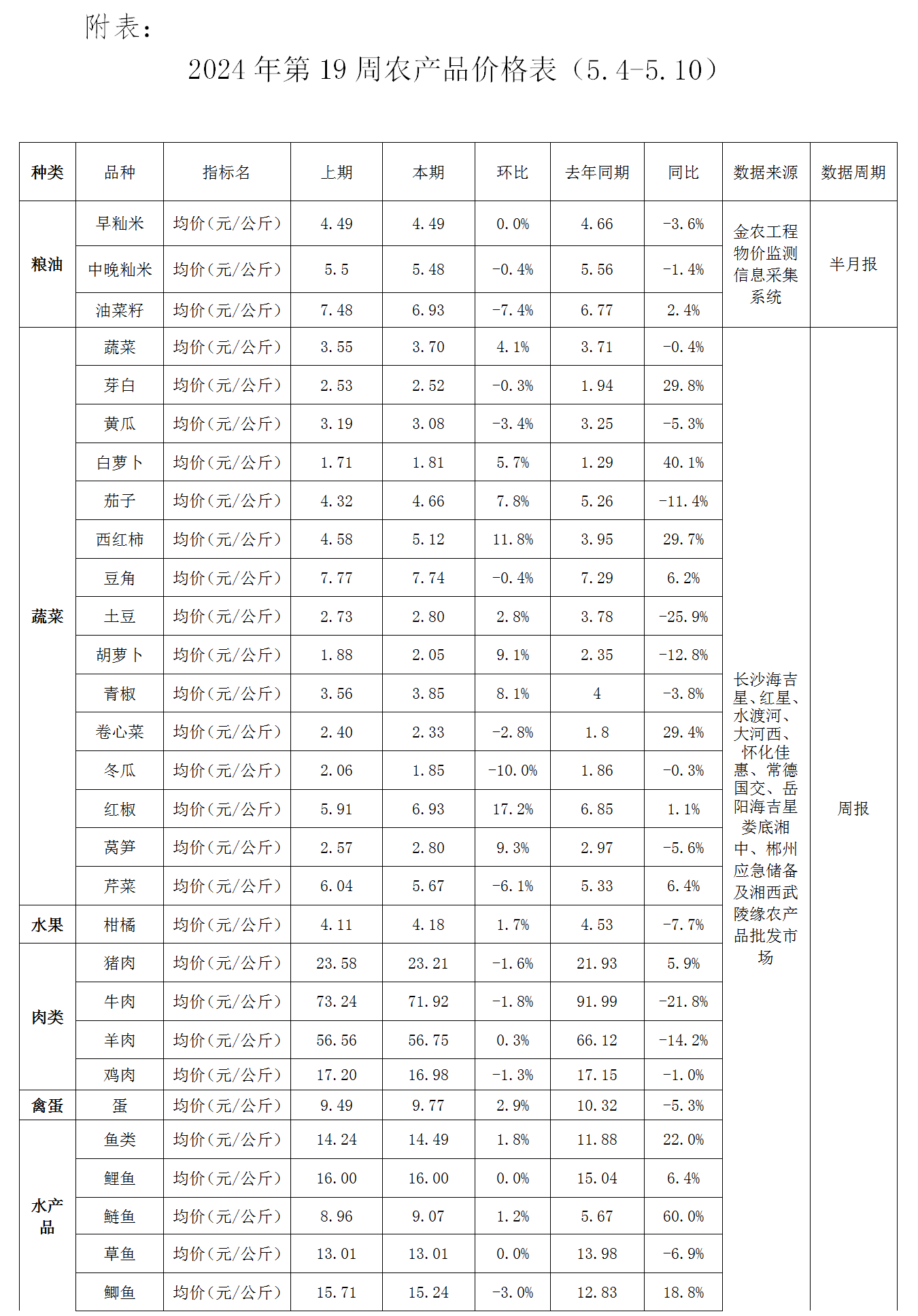 湖南主要农产品批发价格监测周报(2024年第19期)