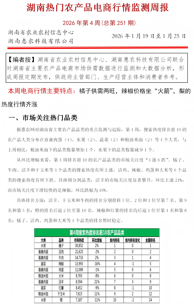 湖南热门农产品电商行情监测周报(2026年第4期)