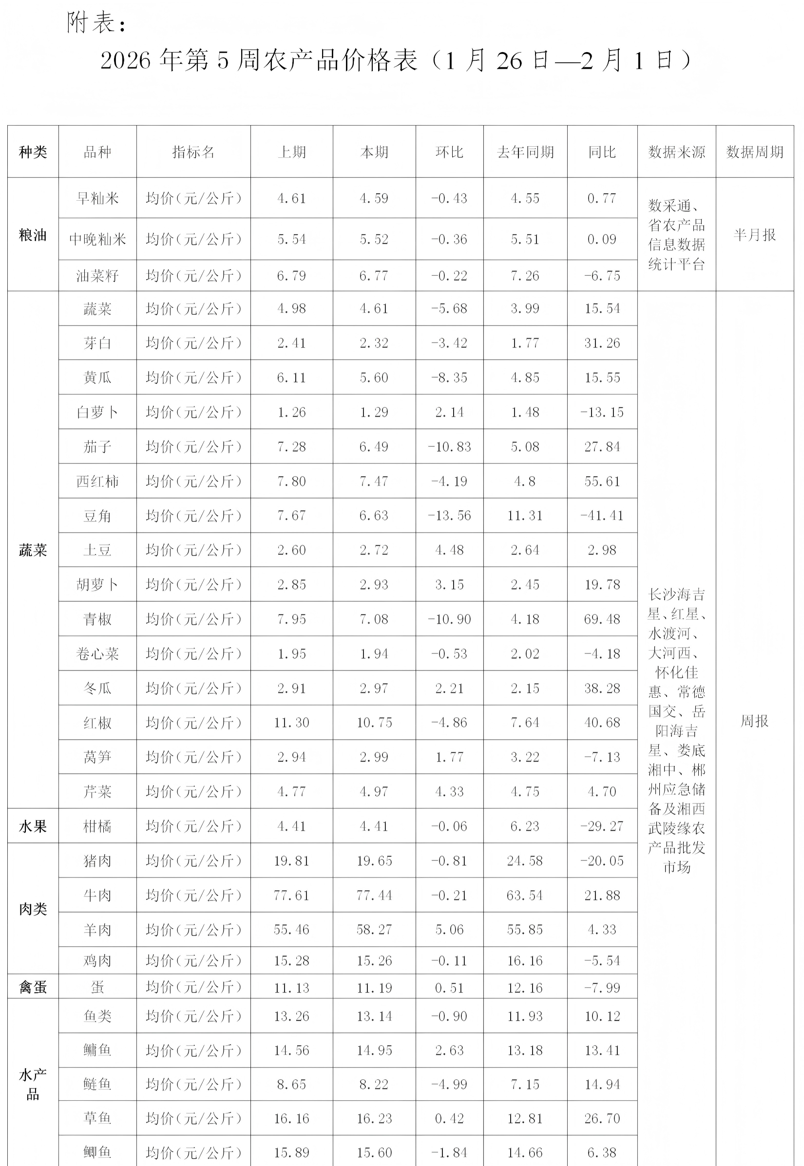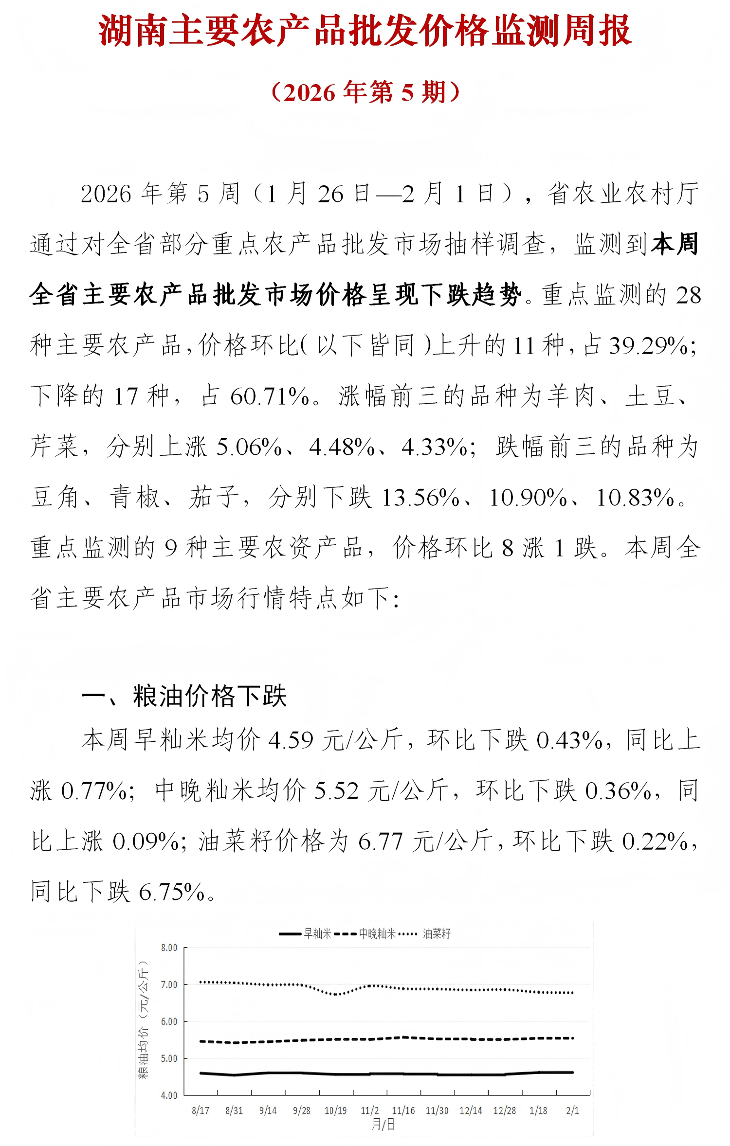 湖南主要农产品批发价格监测周报(2026年第5期)