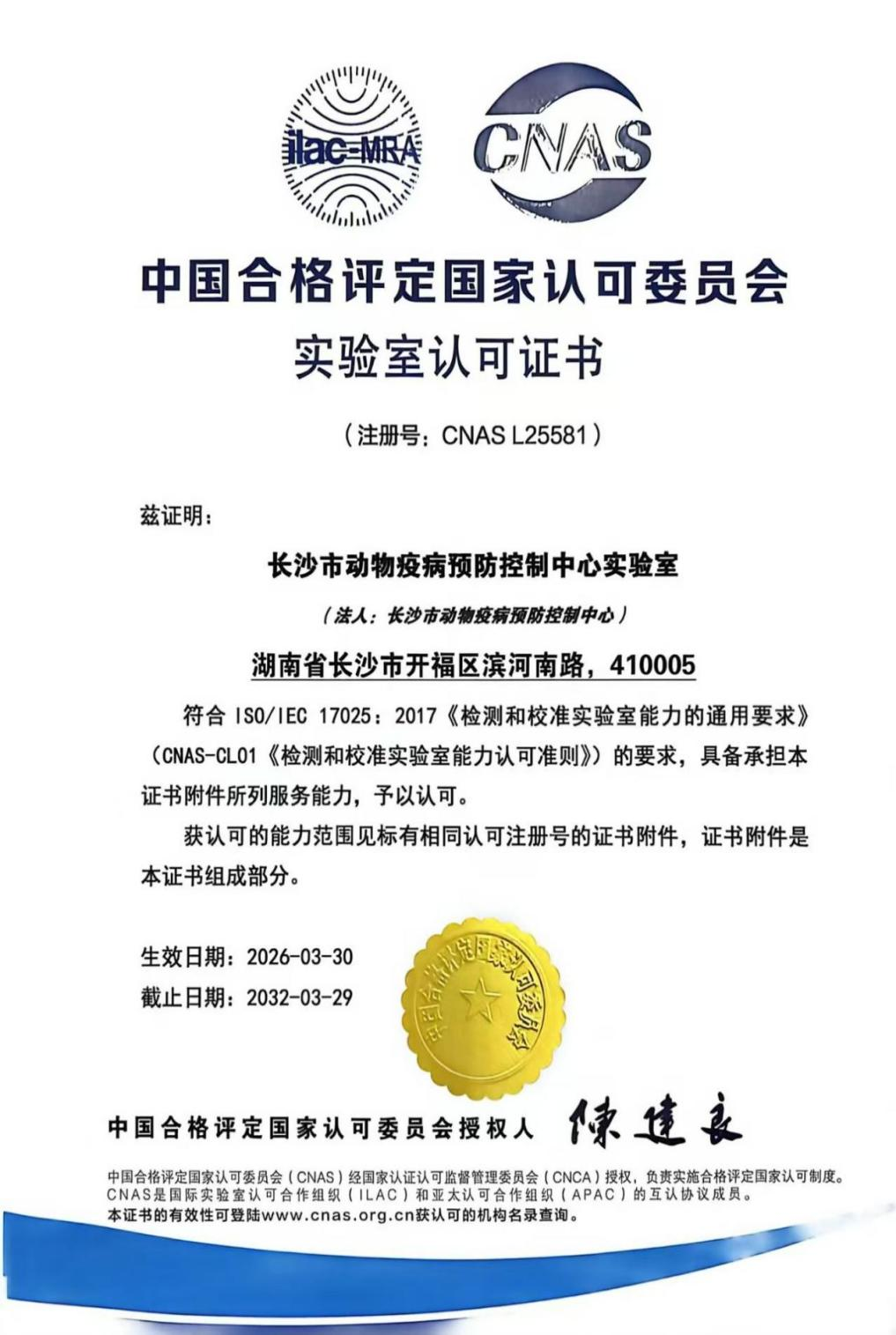 近年来,长沙市动物疫病预防控制中心实验室锚定高标准建设目标,全面完善质量管理体系、升级硬件设施、强化人才队伍建设、严控检测质量、常态化开展能力验证,以严谨规范的管理、精准可靠的技术,稳步提升综合检测能力,最终高标准通过国家级权威评审。CNAS认可,标志着该实验室管理和检测水平达到ISO/IEC17025国际标准,其公信力与权威性全面升级,所出具的检测数据在全球范围内互认,将有力提升全市动物疫病检测与防控能力,为畜牧业高质量发展和公共卫生安全筑牢坚实屏障。